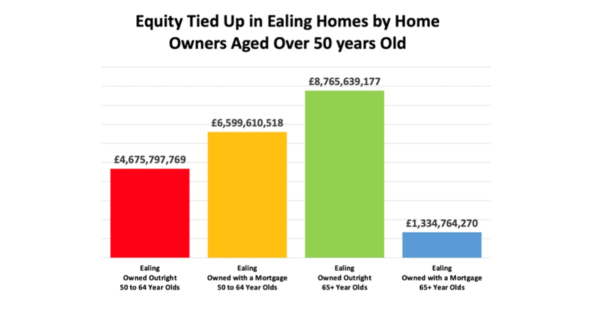 Ealing Baby Boomers own 17,009 homes outright, worth £8,765,639,177 with a further 2,590 homes with a small mortgage on it, worth an additional £1,334,764,270 (an impressive £10.1 billion in Ealing alone).