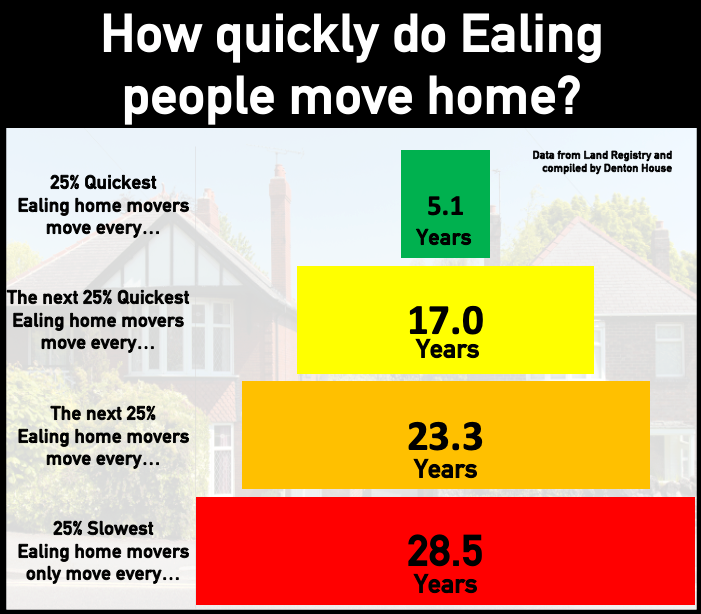 - The quickest 25% of Ealing home movers (i.e. 1st to 10th) moves every 5 years & 5 weeks – that’s a quick move!