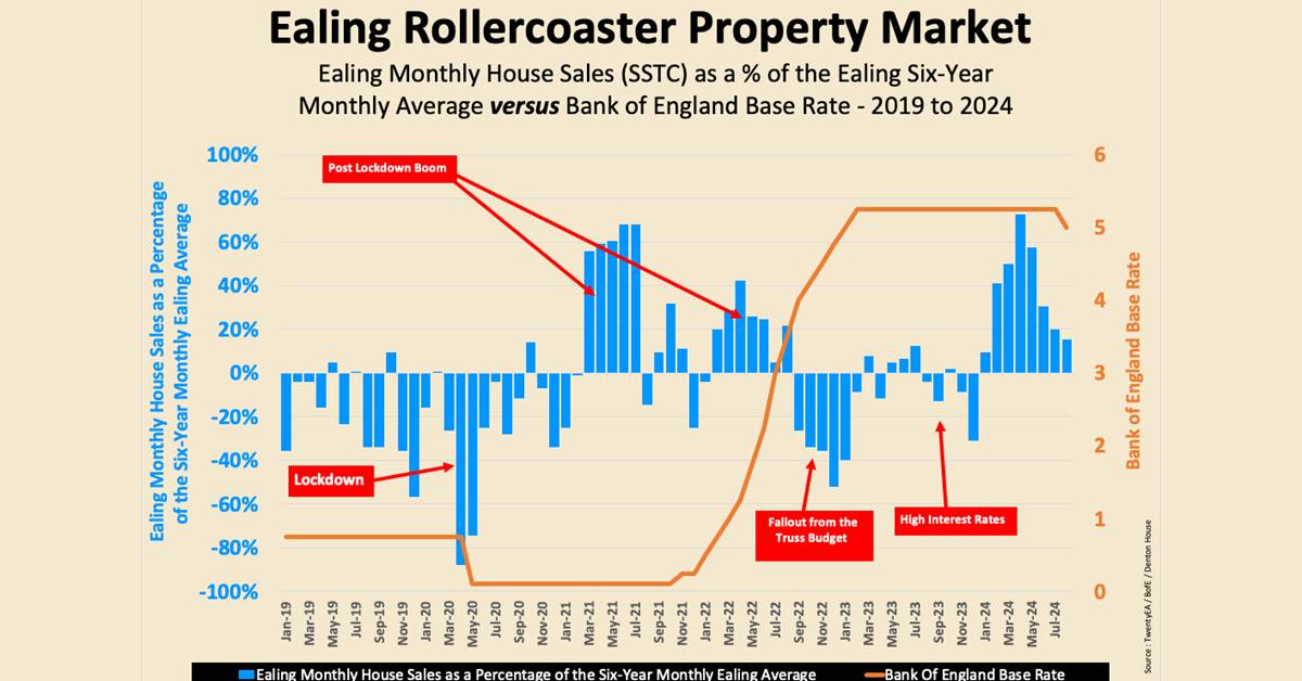 The Ealing property market has experienced a rollercoaster ride since 2019, reflecting the unprecedented challenges and opportunities that have shaped the landscape of home buying and selling in the area. The accompanying graph vividly illustrates these dramatic fluctuations, comparing Ealing's monthly house sales, expressed as a percentage of the six-year (2019 to 2024) average in blue. Also on the graph in orange is the Bank of England's base rate between 2019 to 2024.
