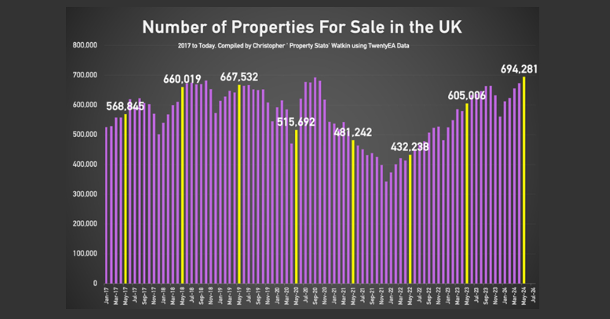 The average number of properties for sale in the UK in May 2017 was 568,845; in May 2018, it was 660,019; and in May 2019, it was 667,532 (an overall average of 632,132 for three years combined). In May 2024, it was 694,281 (as mentioned in the introduction).