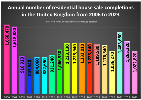The impact of economic challenges on the property market has been more evident in transaction volumes than in prices. Typically, there are about 1.16 million house sale completions annually in the UK. However, this number surged to 1.48 million in 2021 due to the lockdown inducing ‘race-for-space’. It then dropped to 1.26 million in 2022 and further to 1.02 million last year.